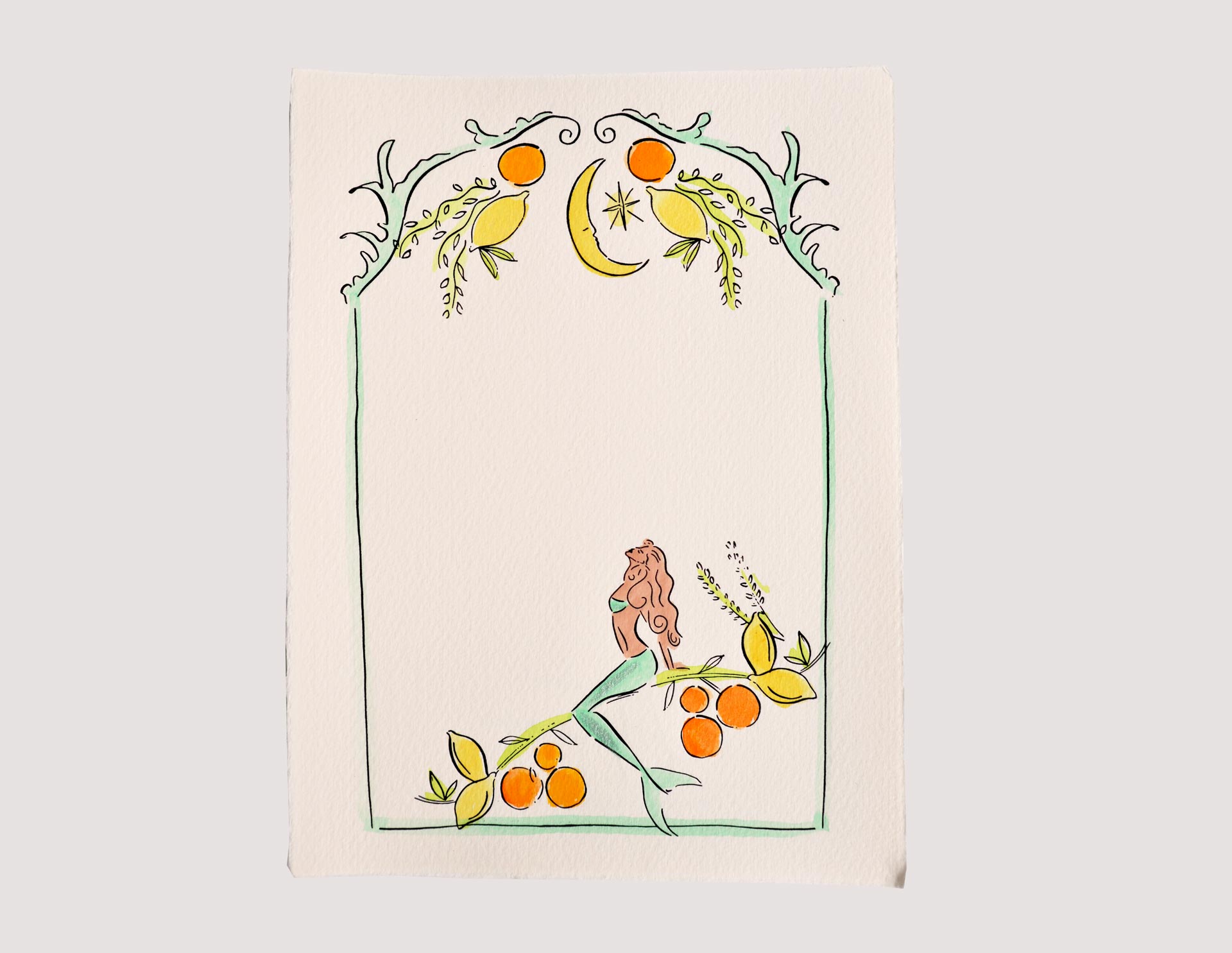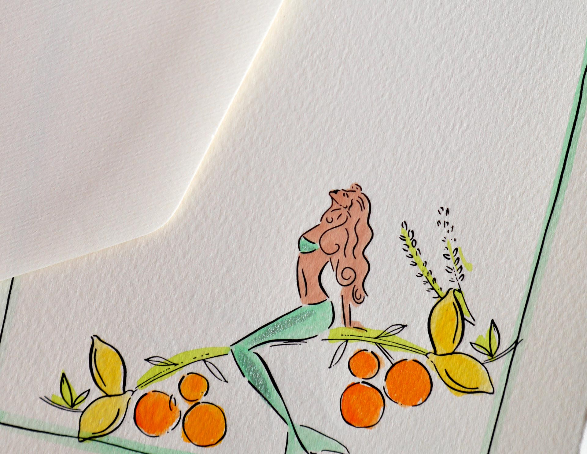 This intricate mermaid design has been letterpress printed on beautiful textured Italian cream deckled edged paper.