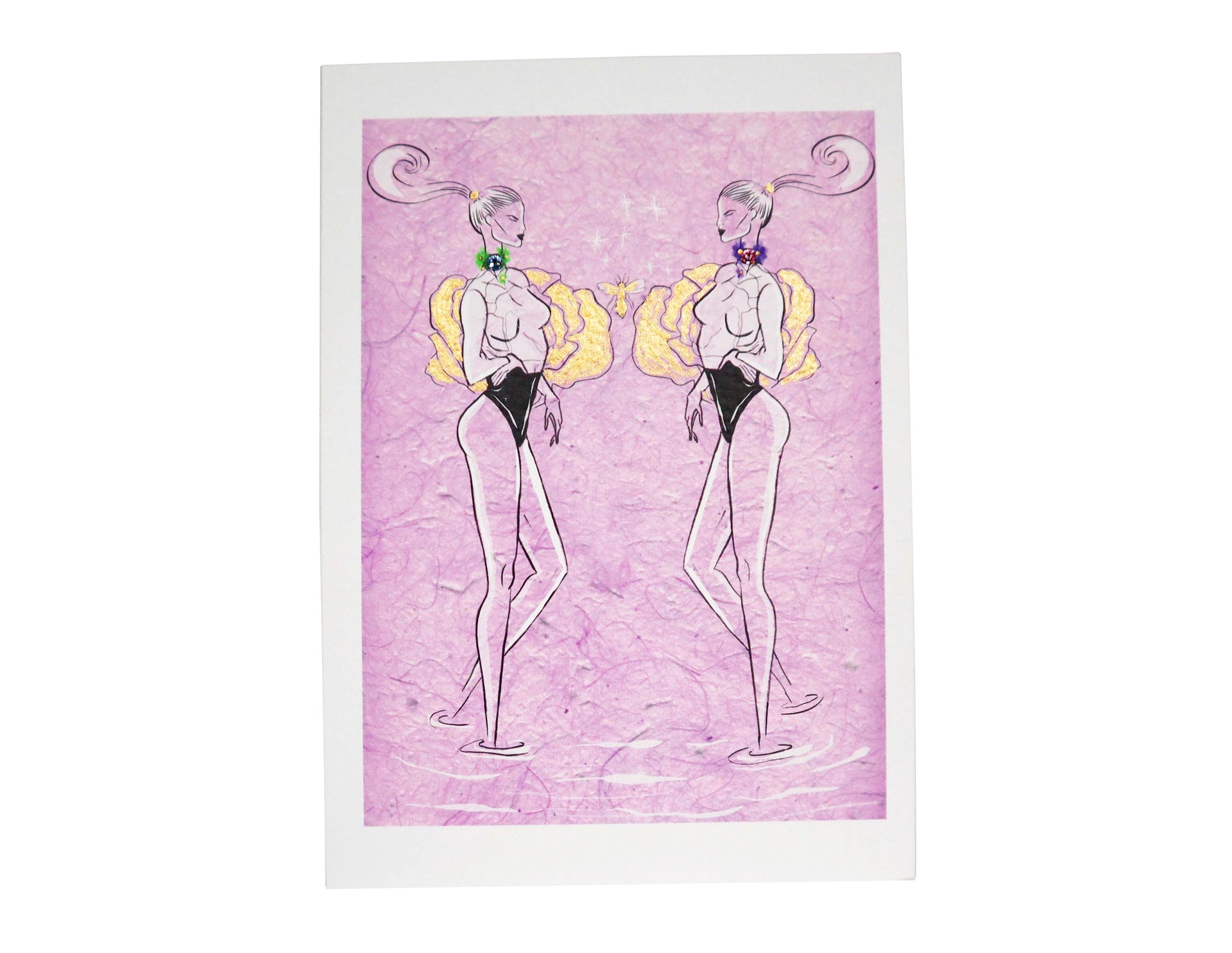Originally painted with a fine brush and fountain pen for intricate details, printed on 300g white Italian paper, gold rose details and bumblebee are individually hand-painted, Swarovski crystals have been added for a touch of sparkle.